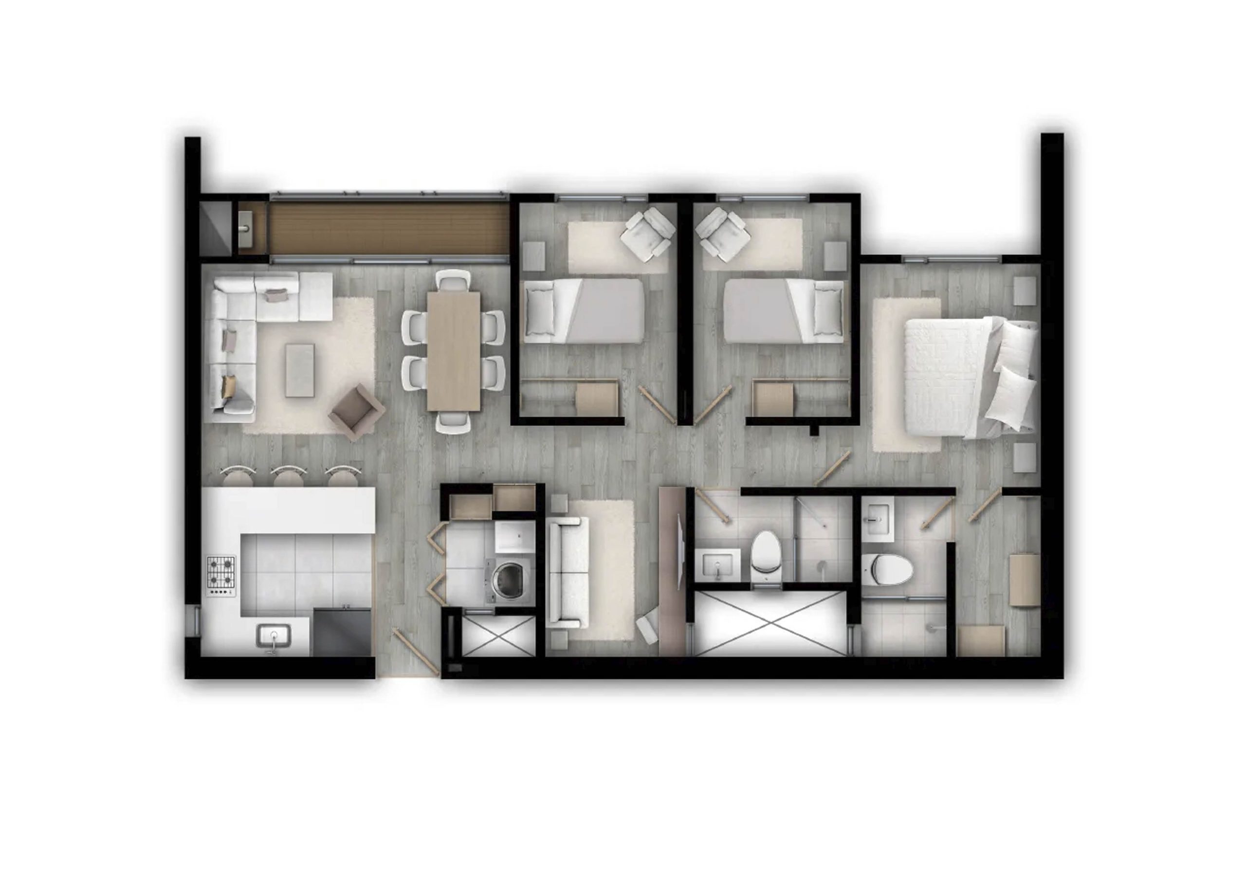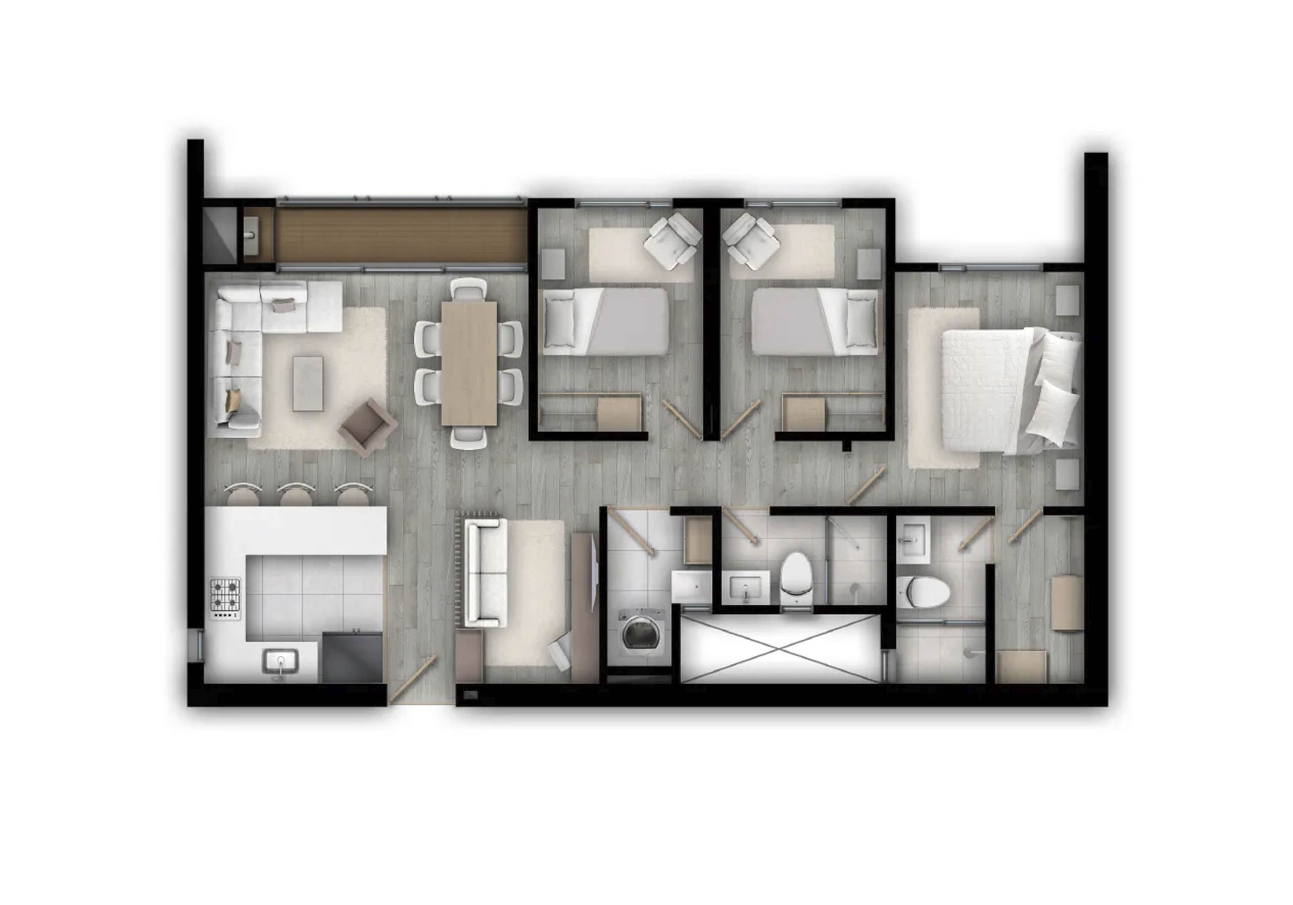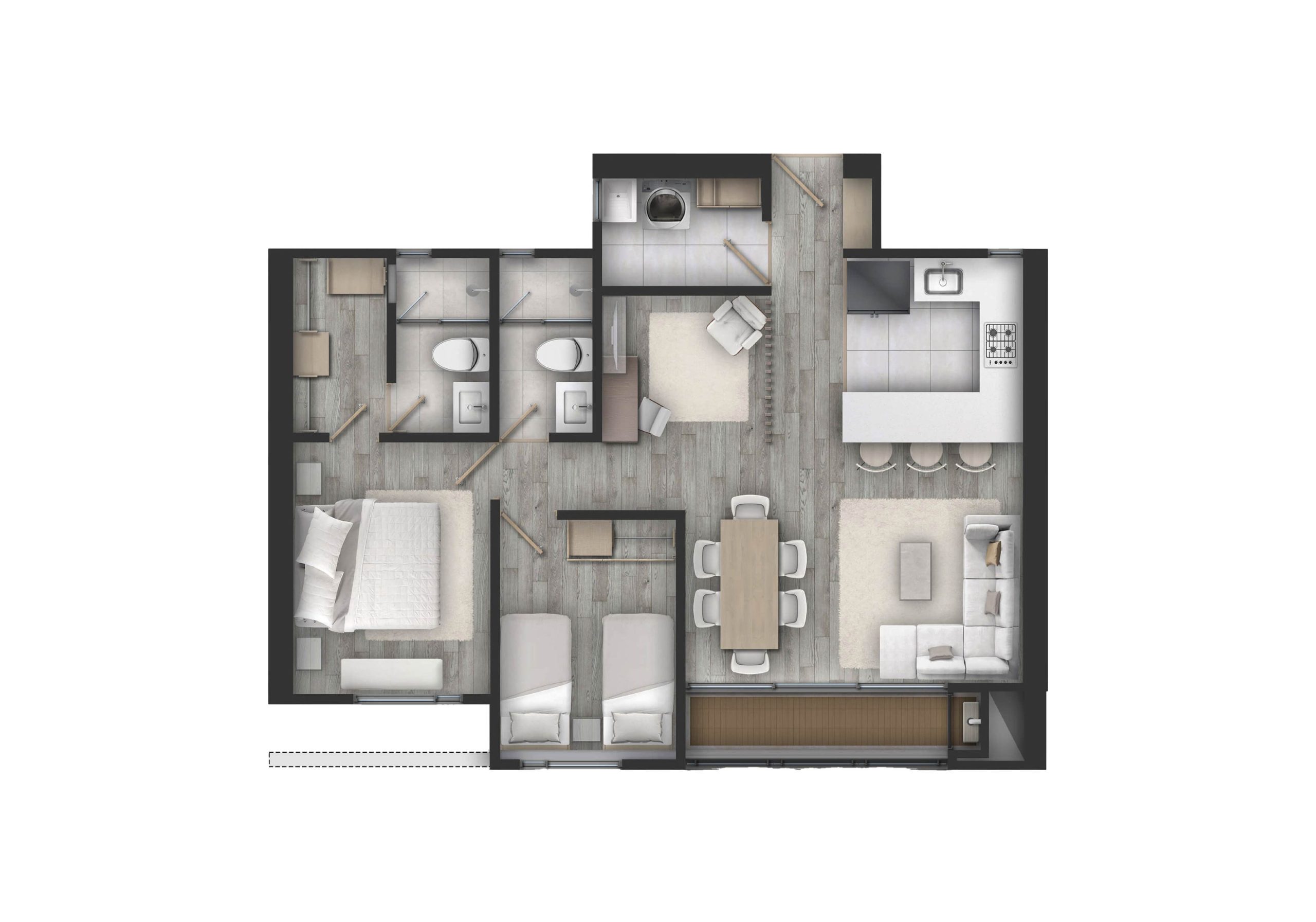 Las dotaciones de las zonas comunes, el mobiliario y los colores planteados, podrán ser modificados por el constructor de acuerdo a la disponibilidad de los elementos al momento de la entrega de los espacios.