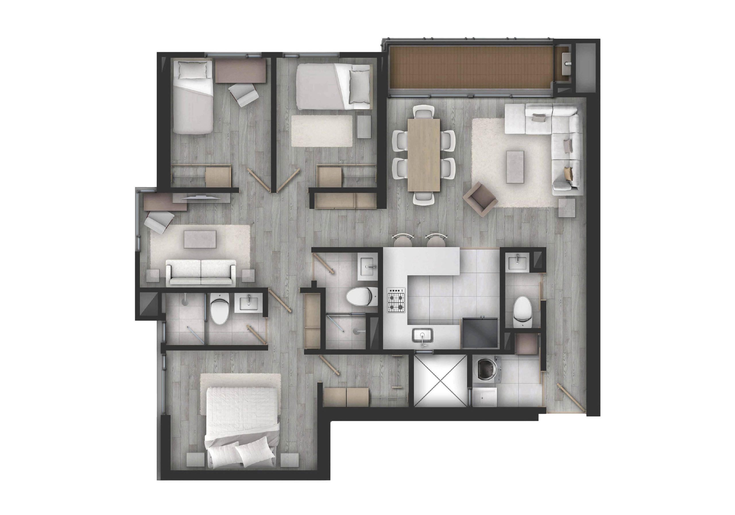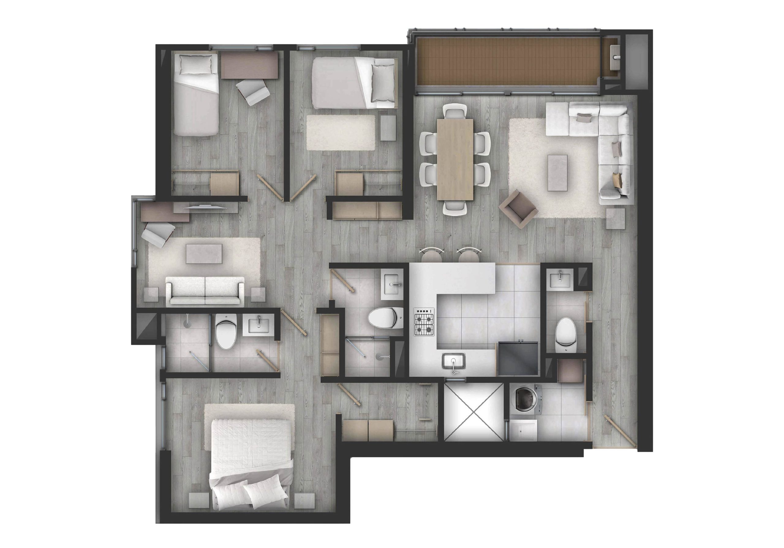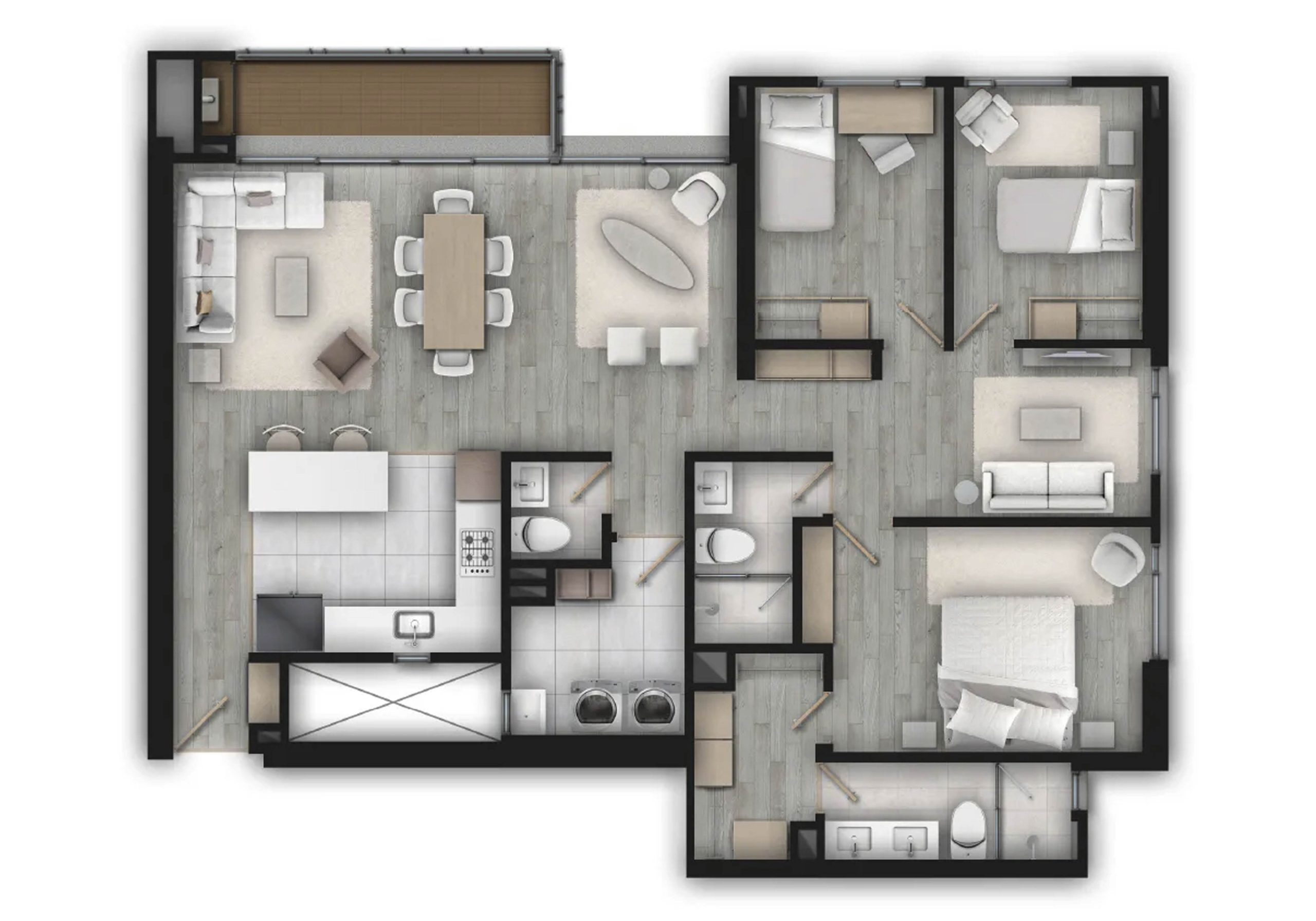 Las dotaciones de las zonas comunes, el mobiliario y los colores planteados, podrán ser modificados por el constructor de acuerdo a la disponibilidad de los elementos al momento de la entrega de los espacios.