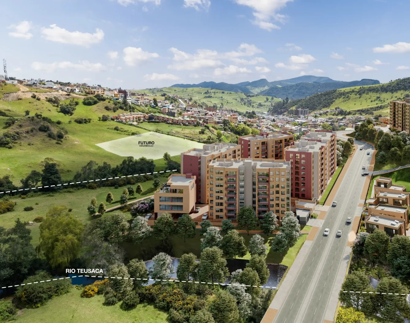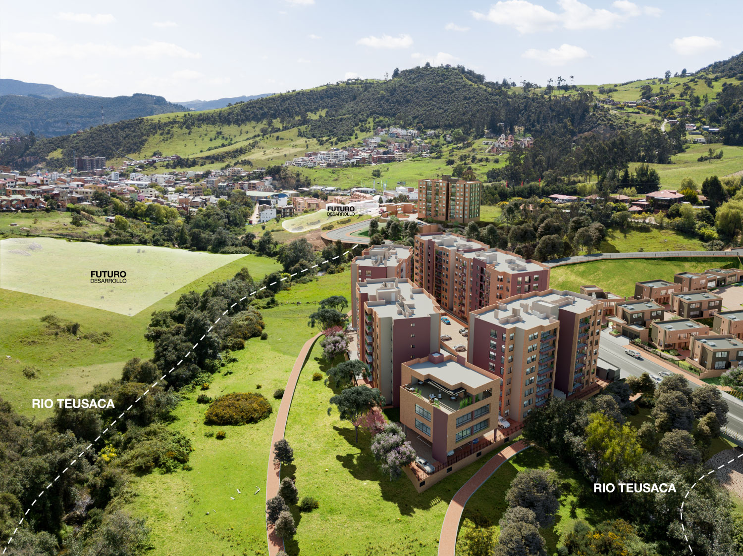 Destacándose por su ubicación colindante con el Río Teusacá, está rodeado de zonas verdes públicas y aire fresco, su diseño cuenta con diferentes tipologías de apartamentos, todo esto lo convierte en el lugar donde vive la tranquilidad.